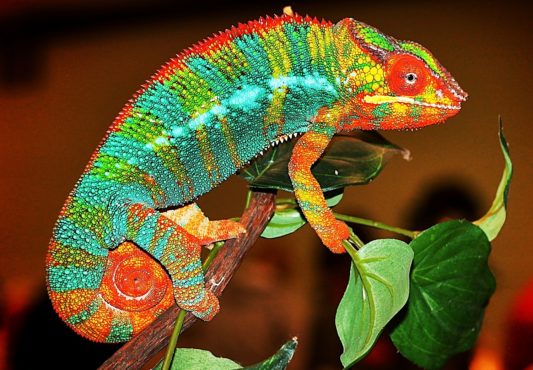 Panther chameleon is the most colorful reptile in the world. They live in tropical forests of Madagascar. Chameleons have the power to turn into different colors that blend perfectly with their surrounding. Panther chameleons are also one of finest examples of camouflaging in animals.