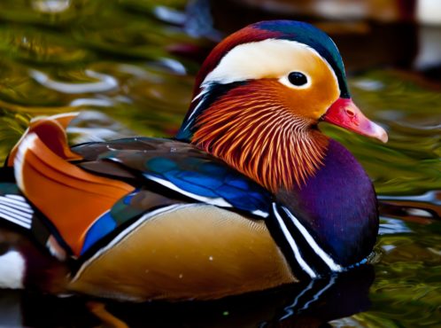 Mandarin ducks are bright colored medium sized duck native to Asia. The male mandarin ducks are more attractive than females. They have a golden appearance with purple chest, light green head, orange-gold feathers and green-copper crest.